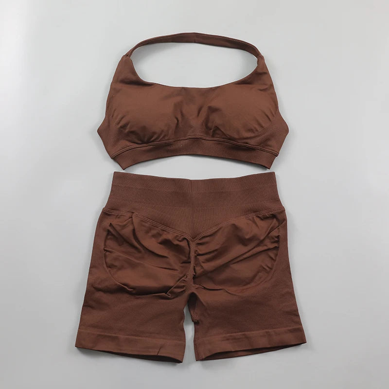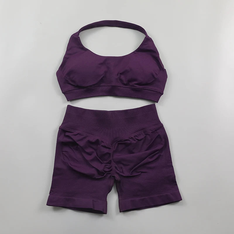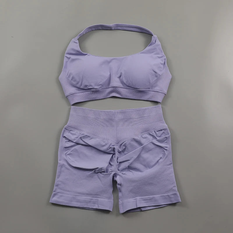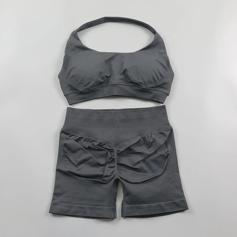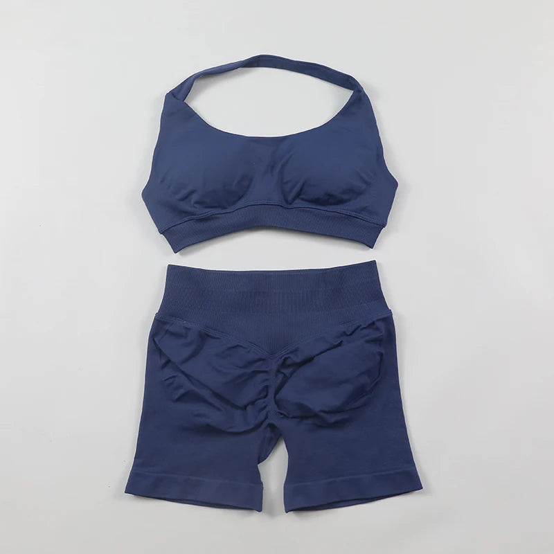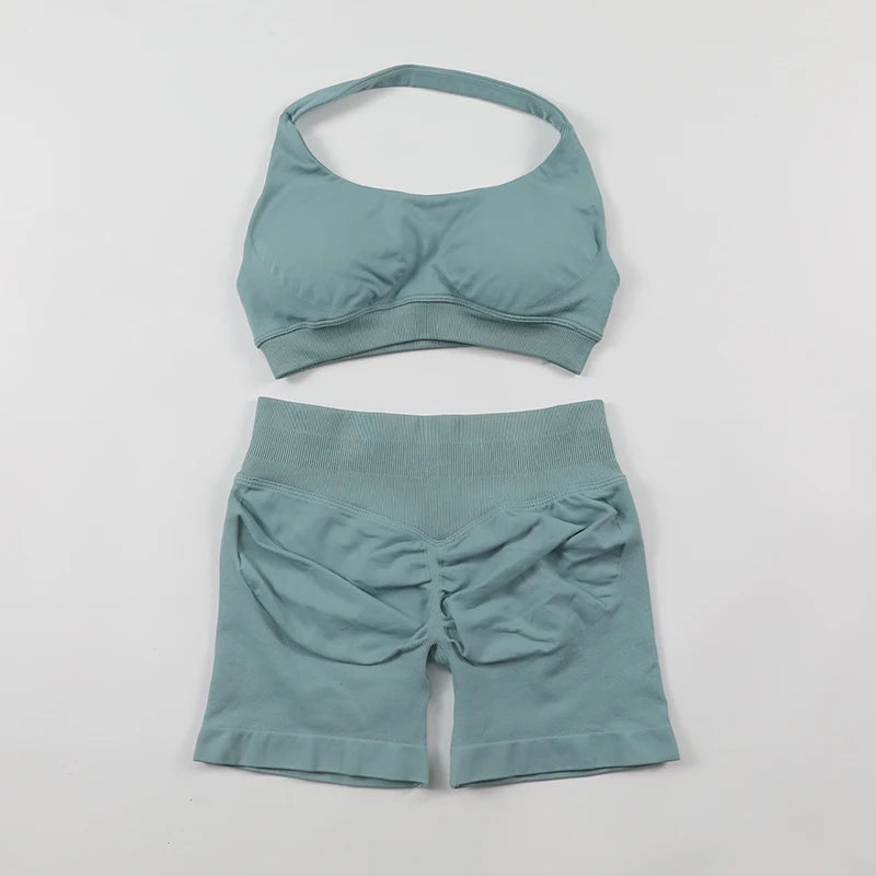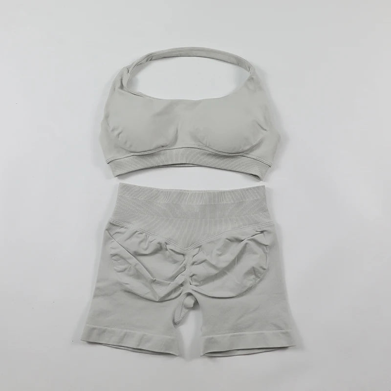 2 Pieces Seamless Scrunch Bum Shorts and Halter Sports Bra Gym Set For Women